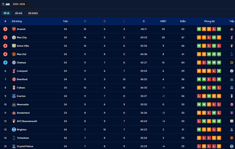 Một điểm rất đáng giá trong cách Rakhoi TV trình bày bảng xếp hạng Ngoại hạng Anh là việc không coi thứ hạng là kết luận cuối cùng, mà là dấu hiệu chiến thuật. Trang web này thường đặt câu hỏi: đội bóng đang đứng ở vị trí đó nhờ lối chơi ổn định, hay nhờ chuỗi trận bùng nổ ngắn hạn?