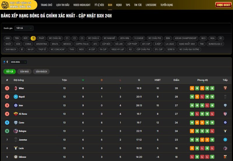 Điều đặc biệt là tôi còn có thể cập nhật bảng xếp hạng bóng đá Ý trực tiếp, theo dõi phong độ các đội như Inter Milan, Juventus hay AC Milan mà không cần mở thêm bất cứ trang nào khác.