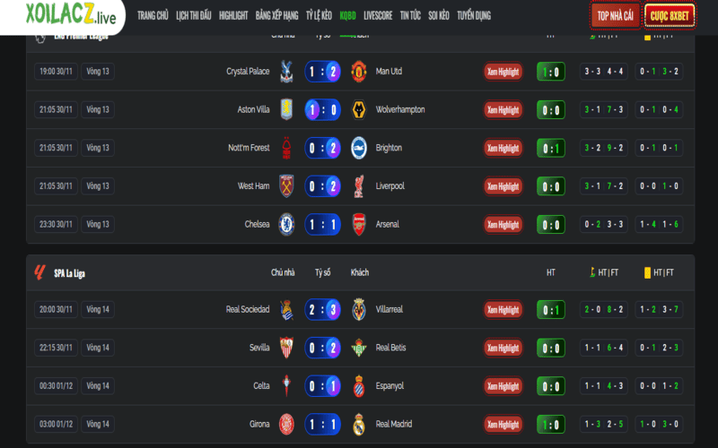 Tỷ số trực tuyến – Cập nhật mọi diễn biến trên sân cỏ